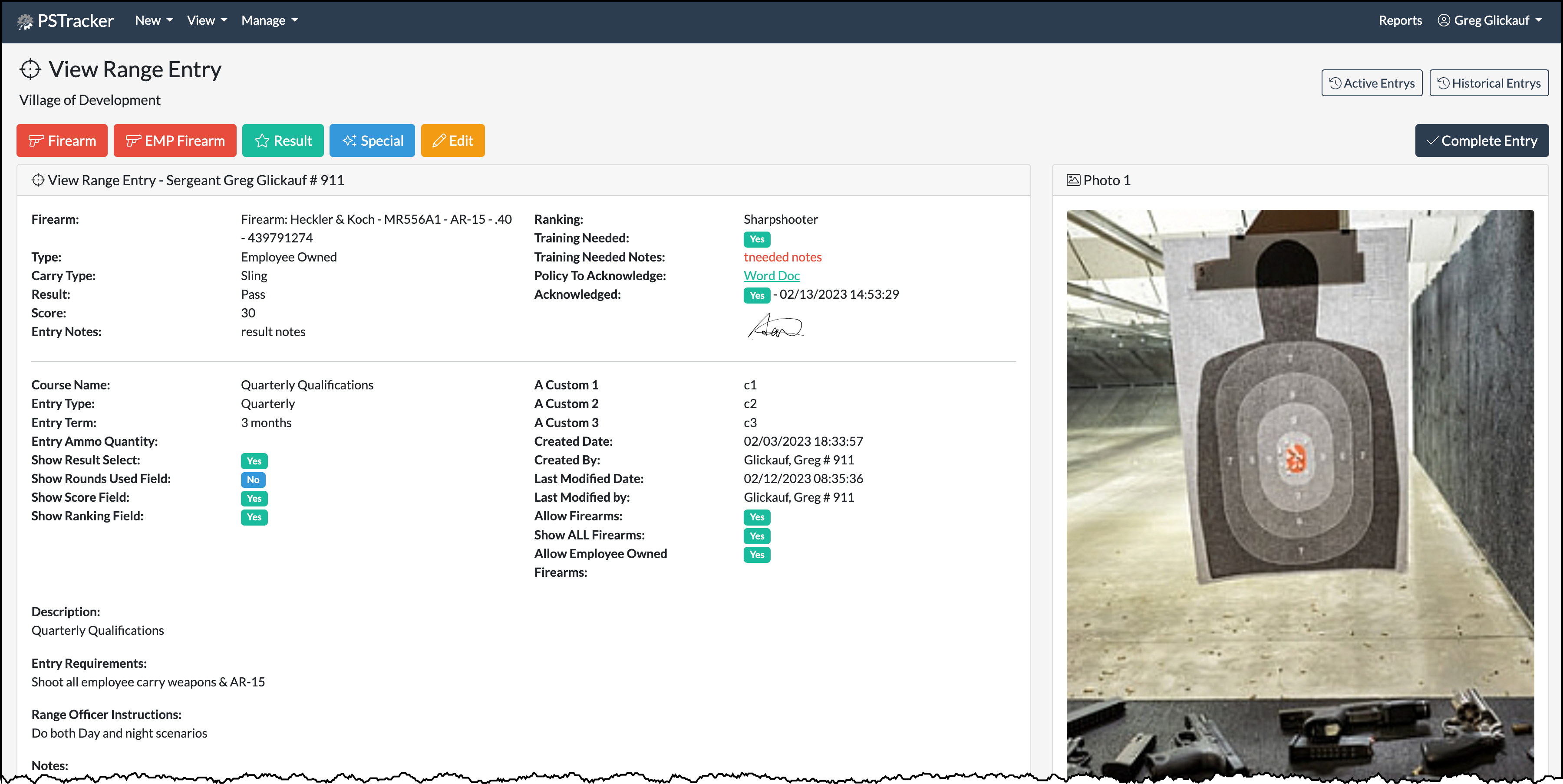 911 Tech simplifies your range qualification and training. Use an iPad on the range to document everything, including a photo of the target. All variables, such as ranking and results, are customized to your agency. Employees can review and acknowledge policy before every range event.