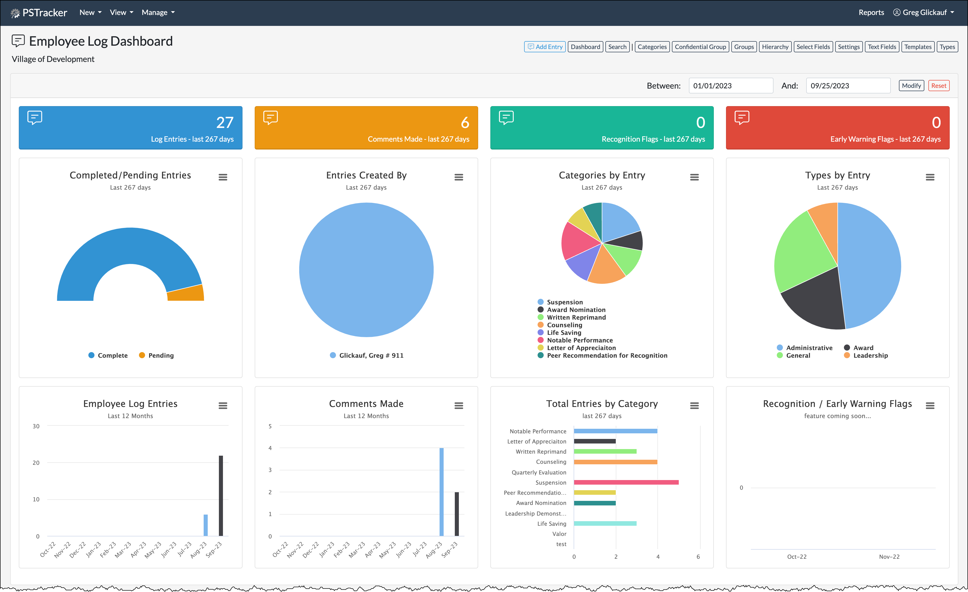 The Employee Log module allows your agency the ability to perform evaluations and document everything about your personnel. Our early recognition and intervention options give your agency a heads up on the issues you have pre-determined need addressing when they occur. The dashboard (shown here) provides a high-level analytical overview of the personnel activity occurring within your agency.