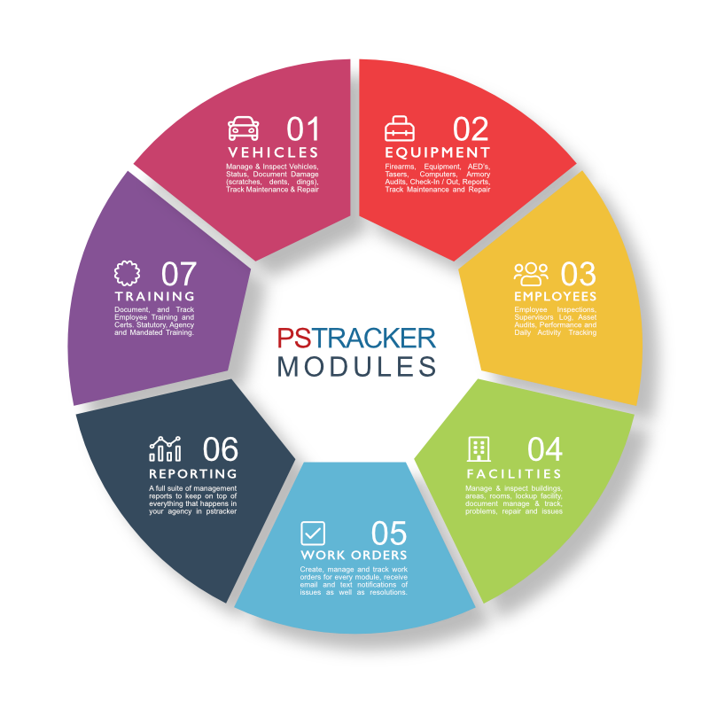 We track, issue, inspect, and manage: AEDs – Ammunition – Assets – Audits – Body Worn Cameras – Buildings – Checklists – Computers – Daily Bulletin – Damage – Directed Patrol – Employees – Equipment – Events – Firearms – House/Vacation Watches – Incidents – Jails – Maintenance – Permits – Prisoner Checks – Permits – Quartermaster – Range – Tasers – Training – Use of Force – Vehicles – Visitor Access – Work Orders
